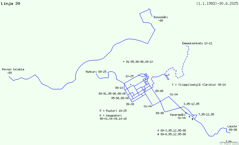 1.6.1989 MUHKURI - Saukonojantie - Uhrilähteenkatu - Alakyläntie - Merikulmantie - Pitkämäenkatu - Naantalin pikatie - Koulukatu - Ratapihankatu - Puistokatu - Puutarhakatu - Ursininkatu - Yliopistonkatu - Aninkaistenkatu - Tuomiokirkkosilta - Uudenmaankatu - Uudenmaantie - Hippoksentie - Lemminkäisenkatu - Mustionkatu - Karhunkatu - Pormestarinkatu - Kirjurinkatu - Maistraatinkatu - Raatimiehenkatu - Raadinkatu - LAUSTE, paluu ...Yliopistonkatu - Koulukatu... (entinen linja 10A, Runosmäen ja Pernon välistä linjaa ajetaan jatkossa numerolla 80)