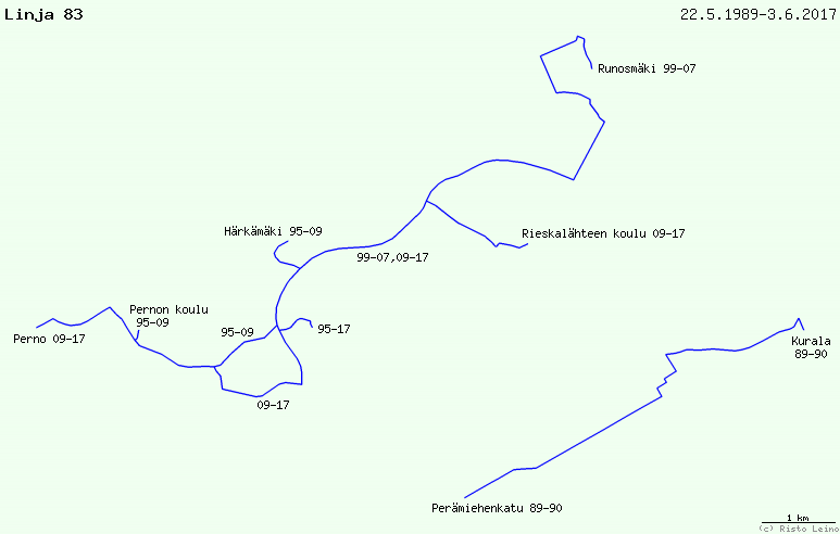 5.6.2017 lopetettu, reitti syksystä 2016: PERNO - Ankkurikyläntie - Pernontie - Länsikaari - Pansiontie - Suikkilantie - Aunelantie - Vienolantie - Vienola - Vienolantie - Aunelantie - Suikkilantie - Satakunnantie - Varkkavuorenkatu - Tammispaltantie - RIESKALÄHTEEN KOULU (10,6 km) (LS-Liikennelinjat)
